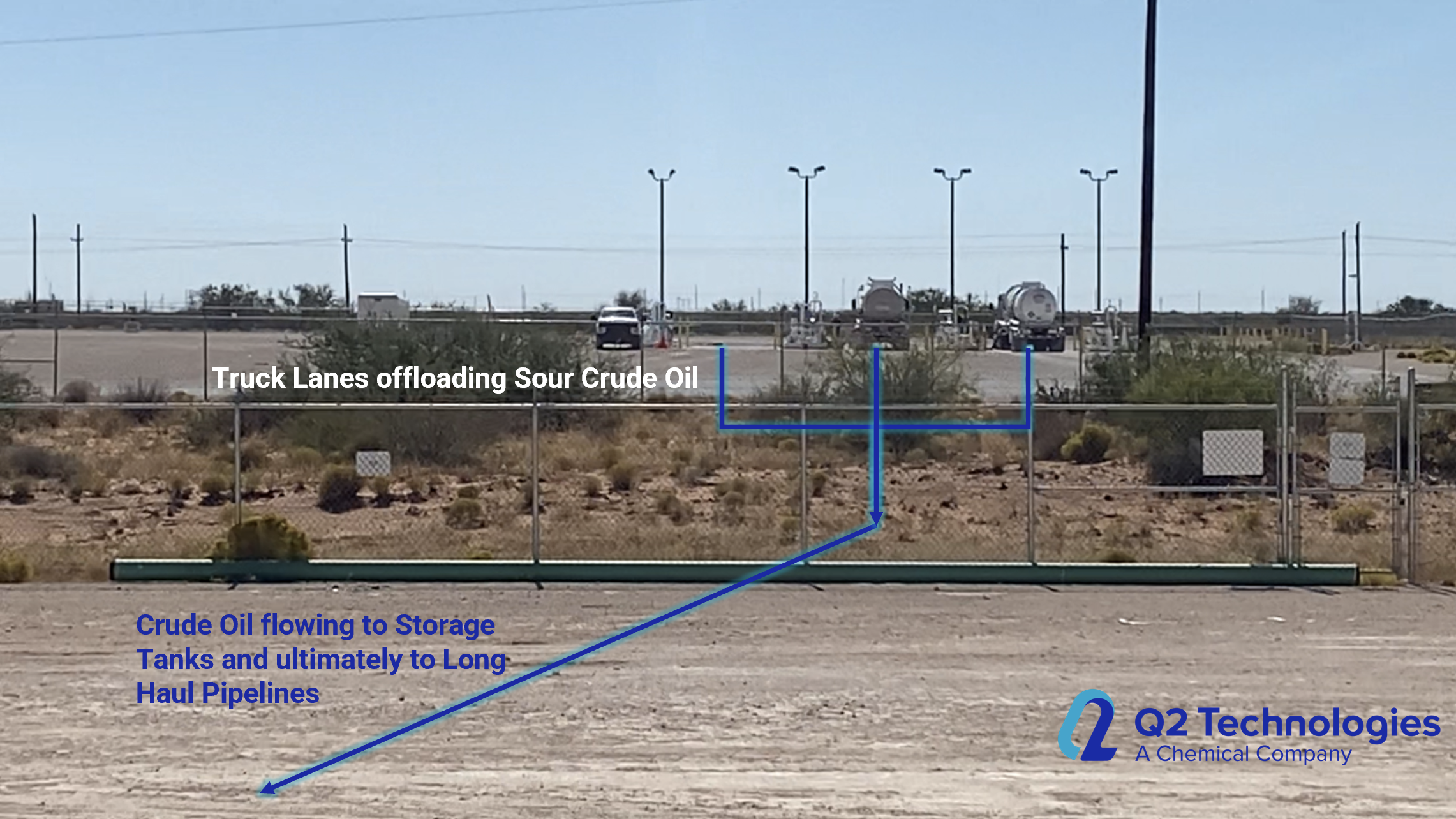 Once the oil hauler, who is transporting a sour barrel, begins pumping volume at the facility, the lease automatic custody transfer (LACT) sends a signal to the Q2 pumps to being dosing. The crude oil is then treated as it is transferred in the tanks. Once treated, the barrel meets H2S specifications and can be sold into a sweet market. This setup is capable of treating all lanes simultaneously several thousand barrels per day at H2S levels in tens of thousands of ppm.