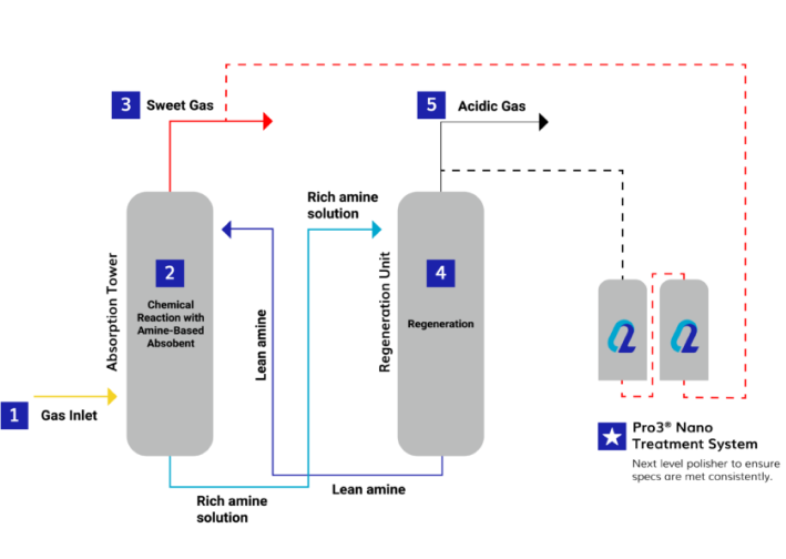 MEA-Triazine is an effective solution for H2S removal. However, each application is different and may require different scavenger alternatives. At Q2 Technologies, we also offer a non-triazine/non-amine H2S scavenger solution: Pro3® Nano. This alternative is a low CAPEX modular solution designed to lower LOE compared to conventional triazine scavengers. Learn more about the differences between Triazine and Non-Triazine for H2S Treatment and find the best solution for your operations. The Pro3® Nano chemical process is specifically designed to treat sour gas volumes using a unique combination of nano particles in a contact tower with a regenerative cycle.